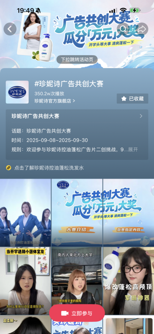 许多作品巧妙融入“开学军训控油”“宿舍蓬松造型”等真实场景,让“控油蓬松”不再只是产品功能,更成为青春态度的一种表达。话题#珍妮诗广告共创大赛# 与#珍妮诗控油蓬松洗发水# 累计阅读量超350万,成为开学季高校圈层的热议焦点。