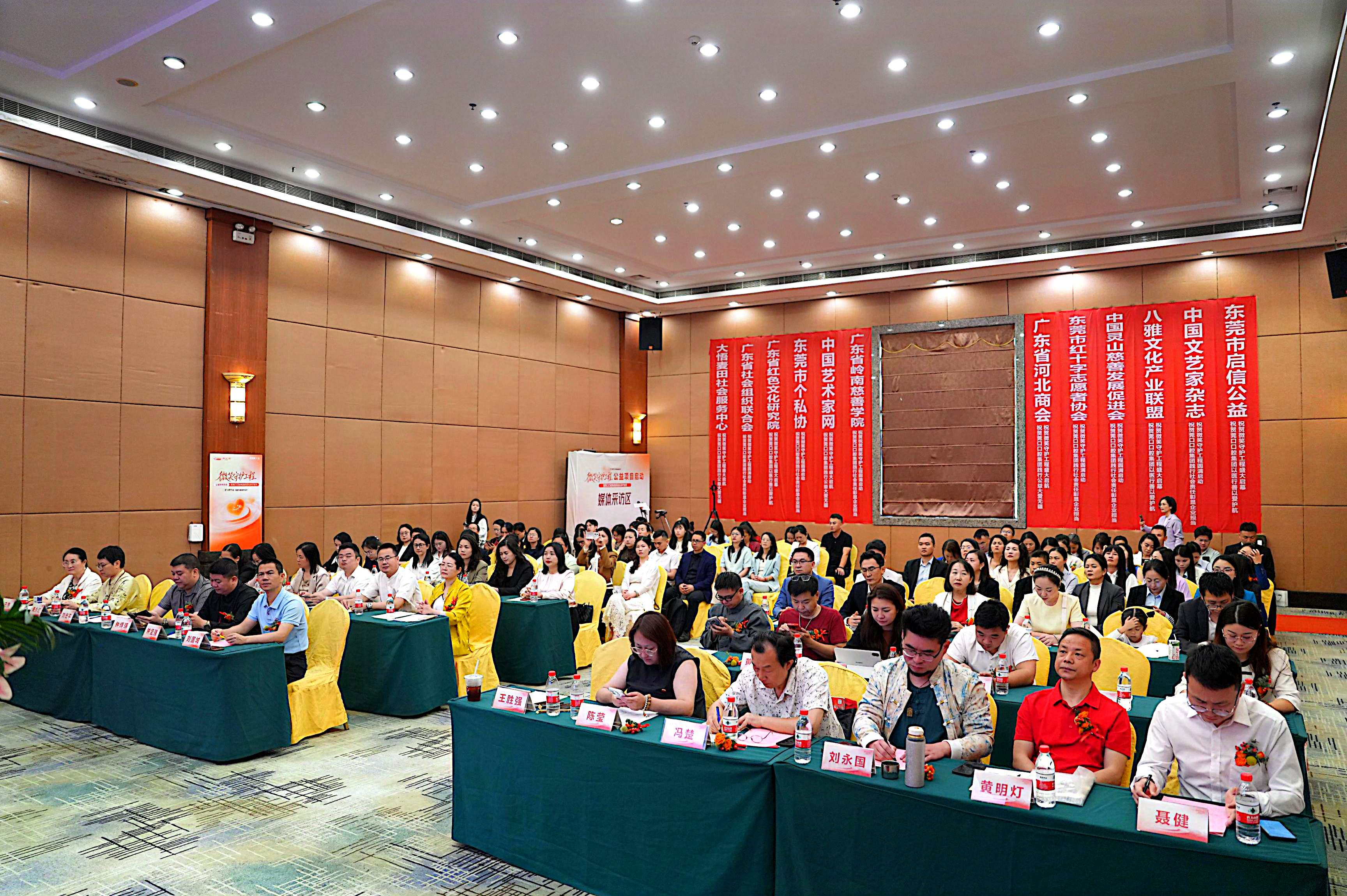 全场掌声中,王胜强、刘国城、冯楚、刘松泰、刘永国、唐永红、田燕、陈莹、钟坚强等核心嘉宾共同推杆,“微笑守护工程”正式启动,礼花绽放,标志着三位一体融合公益生态全面落地。