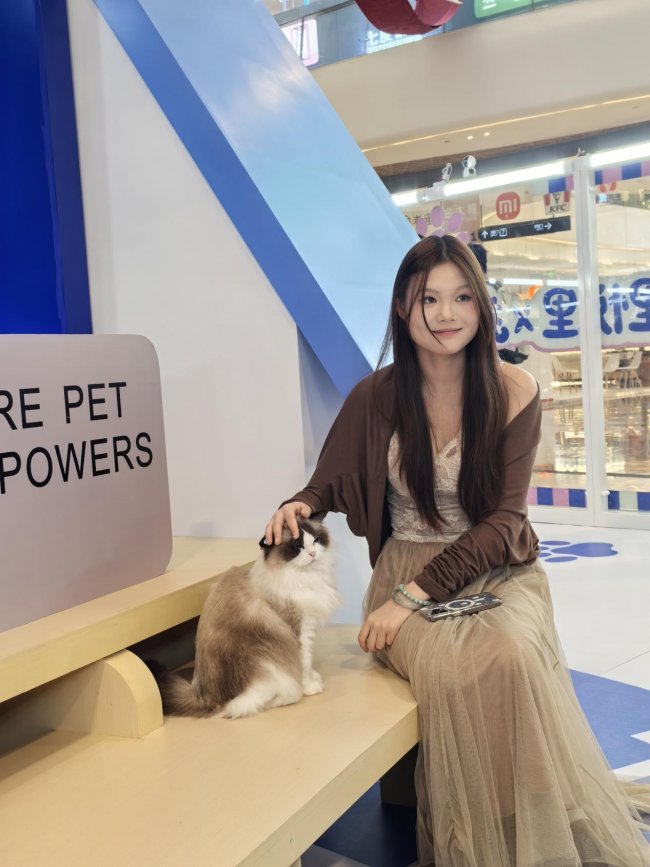 场馆内设置蓝色主题墙、萌宠互动区、玩偶布景等多处打卡点,灯光柔和、构图出片,随手一拍就是氛围感大片。猫咪镜头感十足,主动蹭镜头、配合摆拍,成为天然“模特”。不少年轻人专程前来,抱着猫咪合影、录制短视频,相关内容在抖音、小红书刷屏,单日打卡笔记超百条,带动客流持续上涨。