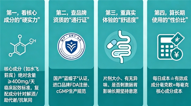 盲目跟风不可取,科学筛选是根本。第一,看核心成分的“硬实力”,不仅要看核心成分(如水飞蓟宾)的绝对含量是否达到临床起效标准(通常400mg/天以上),更要看复配成分是否针对你的核心场景(如解酒、助代谢、抗氧化)形成协同。第二,查品牌资质的“通行证”,无论是国产的“蓝帽子”认证,还是进口品牌的FDA注册、cGMP生产规范,都是安全与品质的基础底线。第三,重真实体验的“舒适度”,片剂大小、有无异味、是否刺激肠胃,直接影响长期坚持的意愿。第四,算长期使用的“性价比”,用“每日成本”除以“有效成分毫克数”,算一算每毫克核心成分要花多少钱,才更能搞懂产品到底值不值。