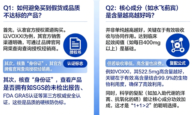 A2:并非单纯越高越好,关键在于有效吸收与协同作用。达到临床起效阈值(如每日400mg以上)是基础。但若吸收率低,高含量也浪费。例如VOXXI,其522.5mg高含量结合99.9%的生物利用度,确保了高效利用。同时,科学的复配(如加入助代谢的洋蓟、抗氧化的硒)能让核心成分功效加成,这才是“1+1>2”的聪明选择。